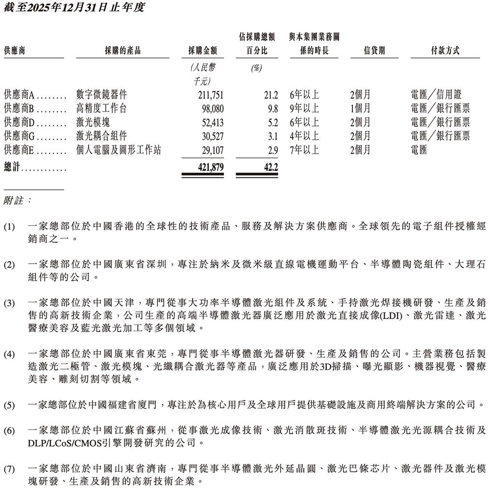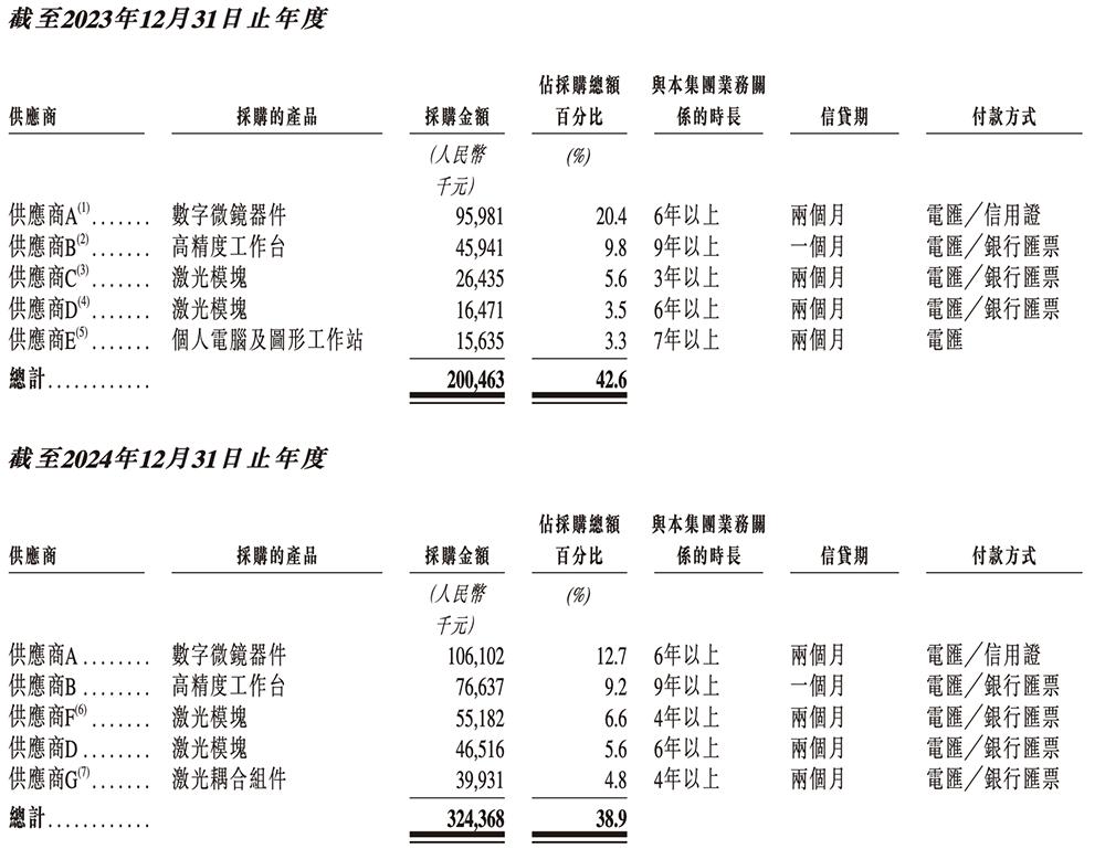 2023年、2024年、2025年,芯碁微装向五大供应商的采购额分别合共约占采购总额的42.6%、38.9%、42.2%。