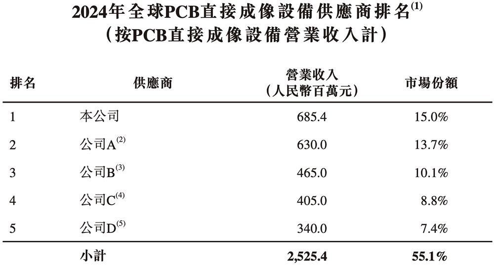 根据灼识咨询的资料,按2024年营收计,芯碁微装是全球最大的PCB直接成像设备供应商,市场份额为15.0%。