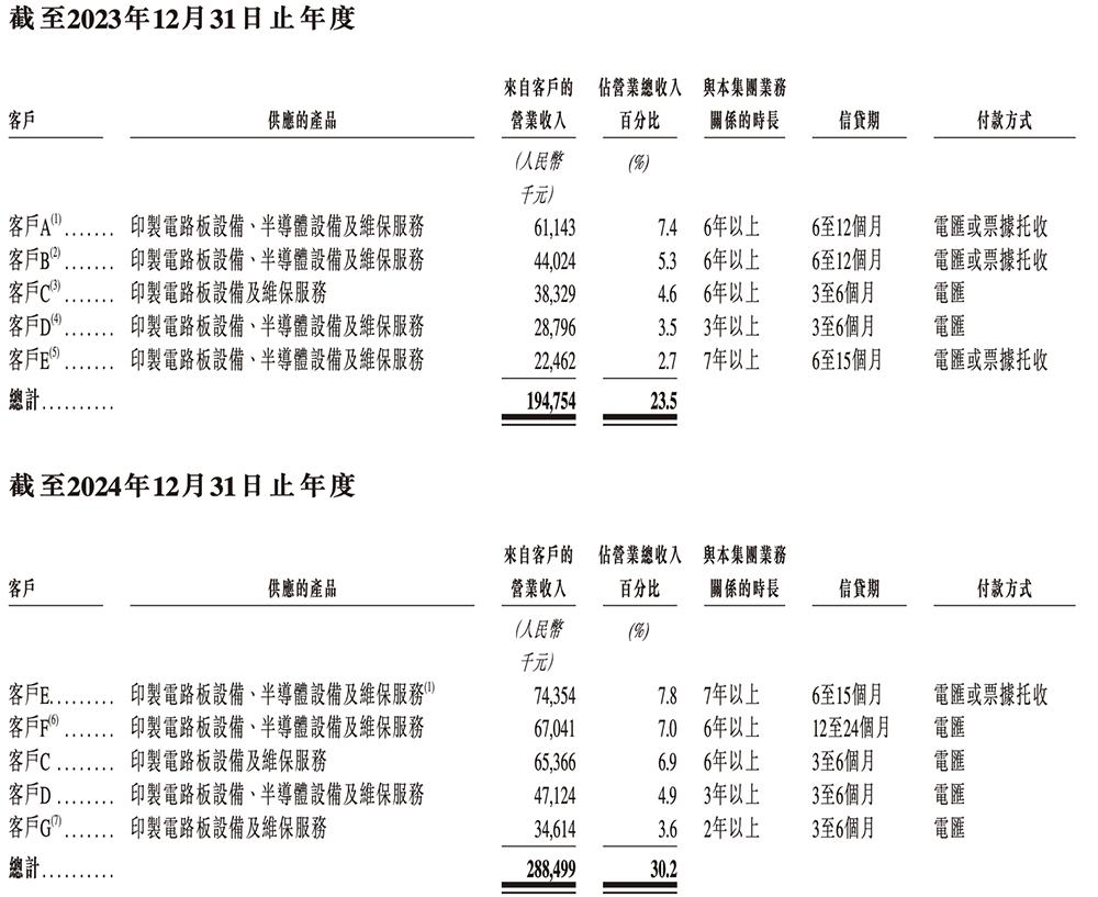 2023年、2024年、2025年,来自芯碁微装五大客户的营收分别合共约占总营收的23.5%、30.2%、41.6%。