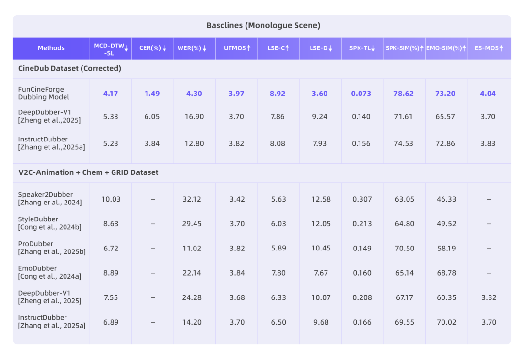 在独白场景下,我们将 Fun-CineForge 与 DeepDubber-V1 和 InstructDubber 进行了对比。结果显示,Fun-CineForge 在词错率、唇部同步、时间对齐、音色相似度等各项指标上均明显优于基线模型。