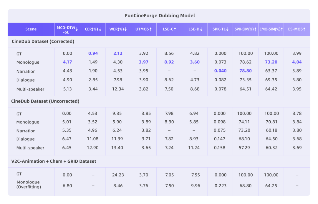 实验结果显示,在多个关键指标上,Fun-CineForge 配音模型都优于现有开源配音模型,包括: