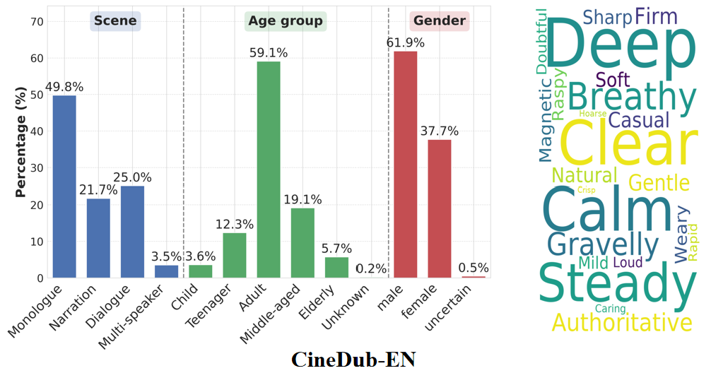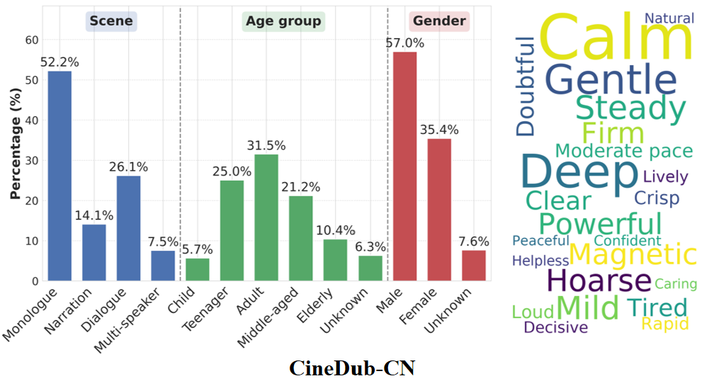 注释:从 350 多部的中英文影视剧中生产的 CineDub 数据集在场景类别,年龄分布,性格分布,音色热词的统计情况。