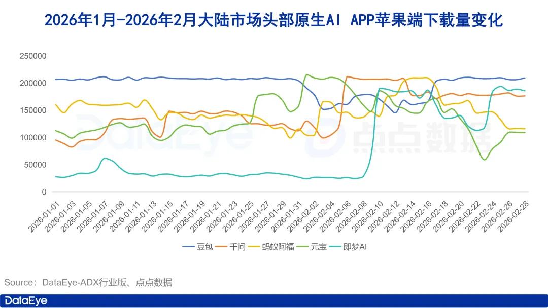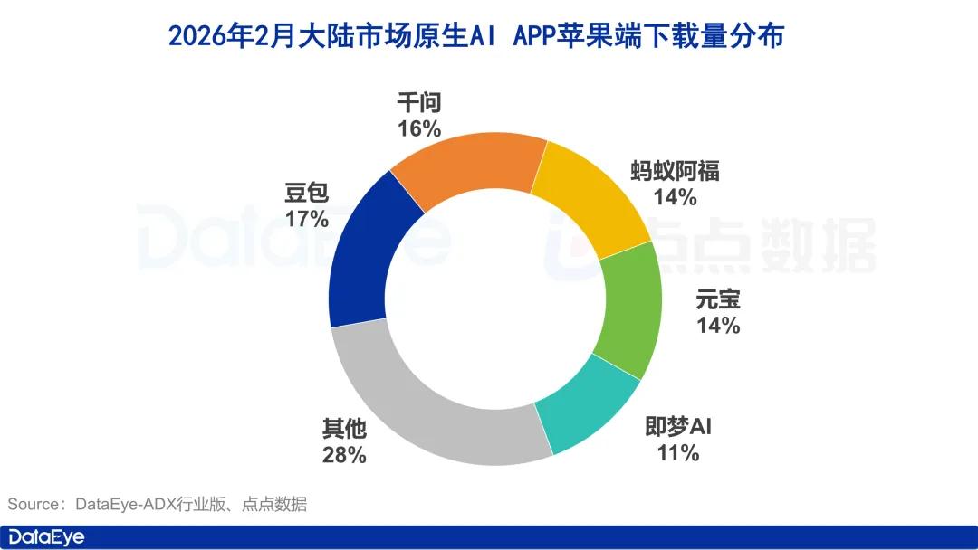 点点数据显示,2026年2月大陆市场苹果端原生AI APP下载量榜单由豆包蝉联榜首,下载量515万次,环比1月下滑20.04%,千问、蚂蚁阿福、元宝、即梦AI紧随其后,下载量均超300万次,其中即梦AI下载量环比大涨228.43%,跻身榜单TOP 5。