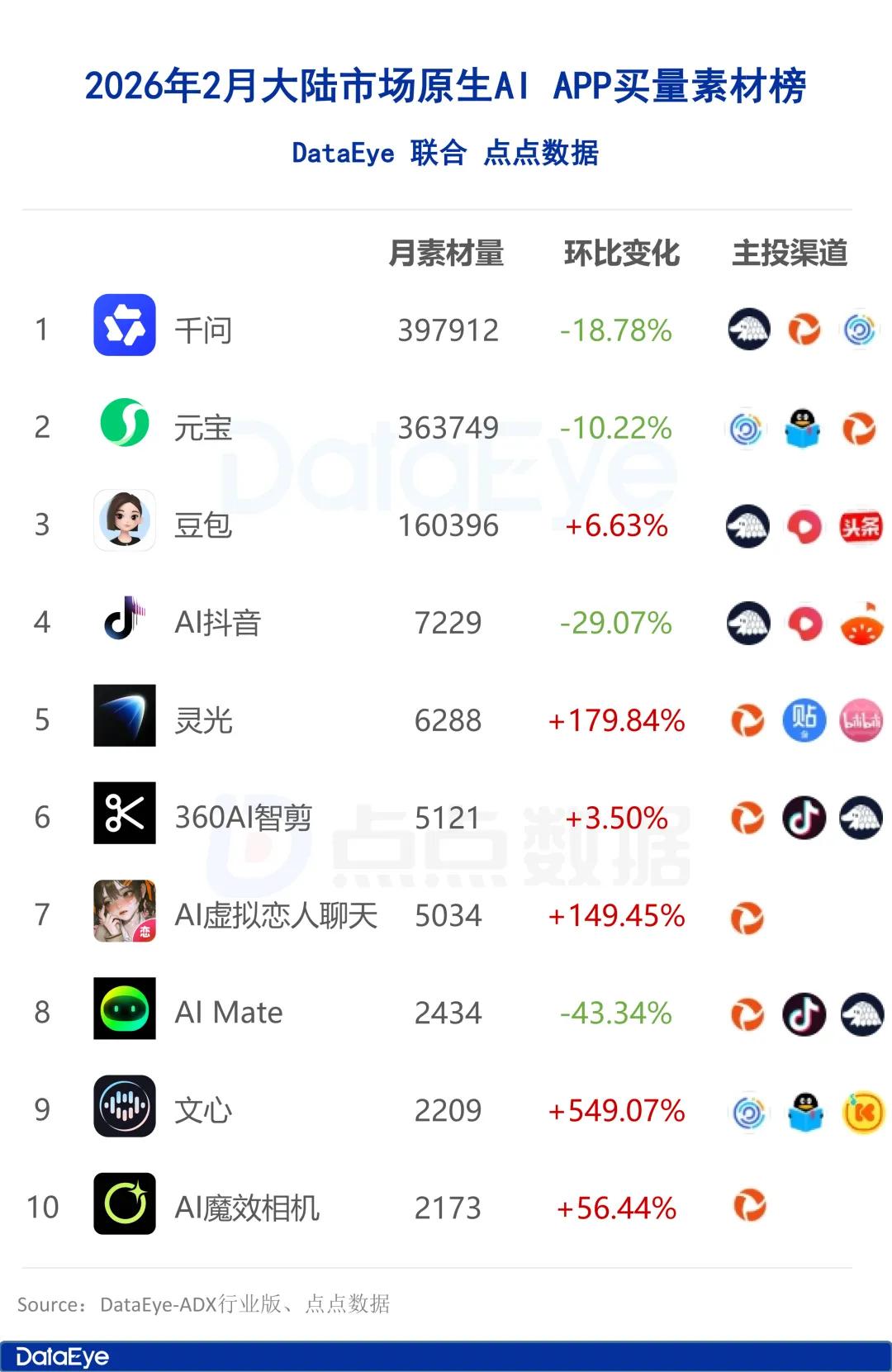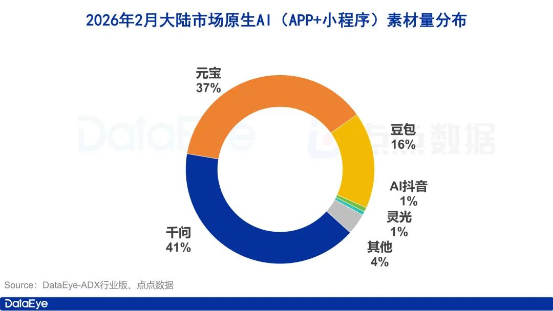 其中千问、元宝、豆包、AI抖音和灵光位列TOP 5,这5款产品占据了大陆市场原生AI产品月投放素材量的96%。