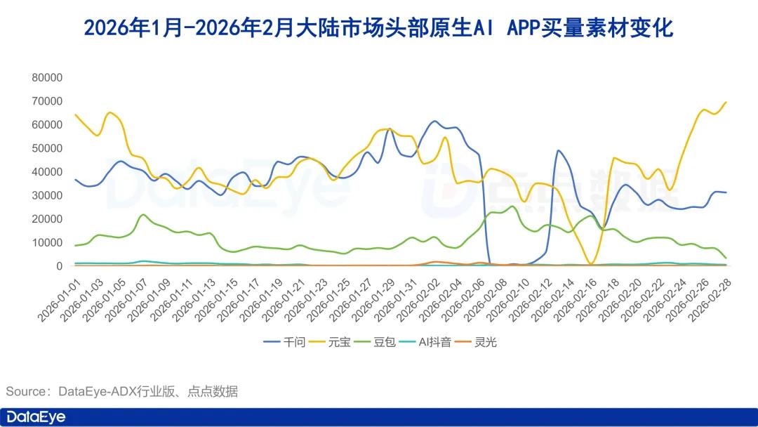 截至2月底,元宝日投放素材量逼近7万组,千问则维持在3万组左右。