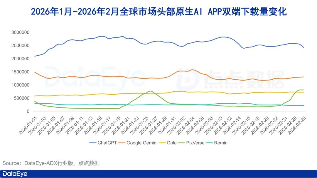 点点数据显示,2026年1月至2月,全球市场头部原生AI APP中,ChatGPT双端预估下载量大幅领先同类产品,Google Gemini紧随其后,不过值得注意的是这两款头部产品2月份下载量均出现明显下滑。