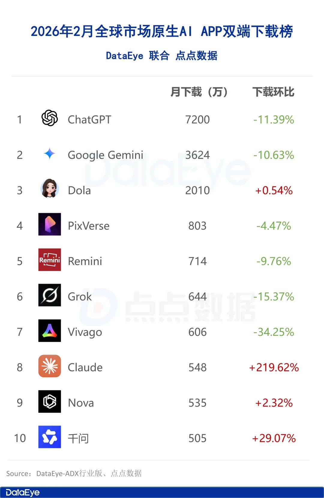 点点数据显示,2026年2月全球市场原生AI APP双端下载榜由ChatGPT蝉联榜首,下载量7200万次,环比1月份下滑了11.39%,位列第一梯队;Google Gemini和Dola紧随其后,下载量分别为3624万次和2010万次,环比1月分别下滑了10.63%和上涨了0.54%,位列第二梯队;其余产品下载量均不足千万次,位列第三梯队。