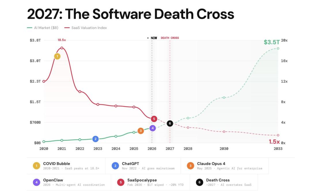 仔细看下面这张图,AI市场的绿线急升,SaaS估值的红线暴跌,在2027年,两条线将交汇形成死亡交叉!