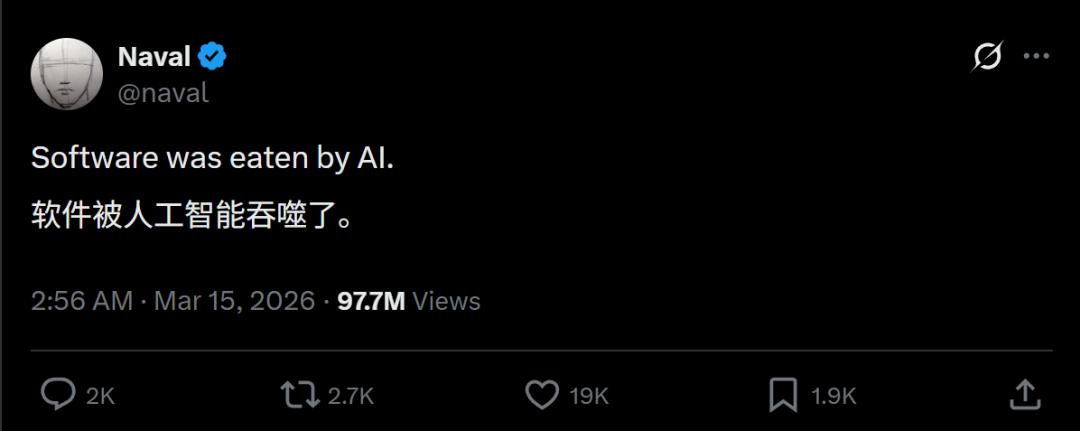 马斯克转发了百万粉大V Naval的这条发言:AI,正在吞噬全球软件行业!