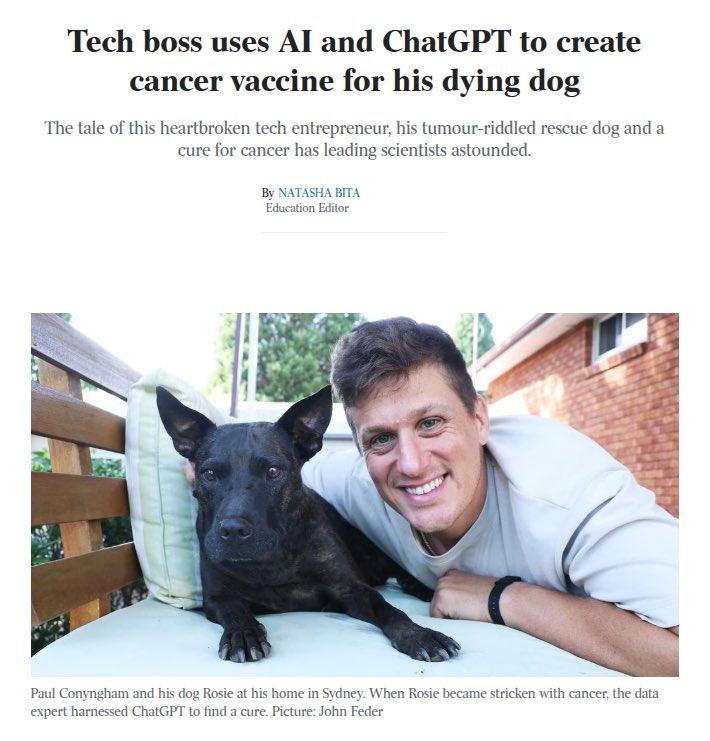 甚至还有一条更应景的新闻,就在周末,澳大利亚一位科技创始人使用ChatGPT和AlphaFold,为自己垂危的爱犬定制了一种癌症疫苗。