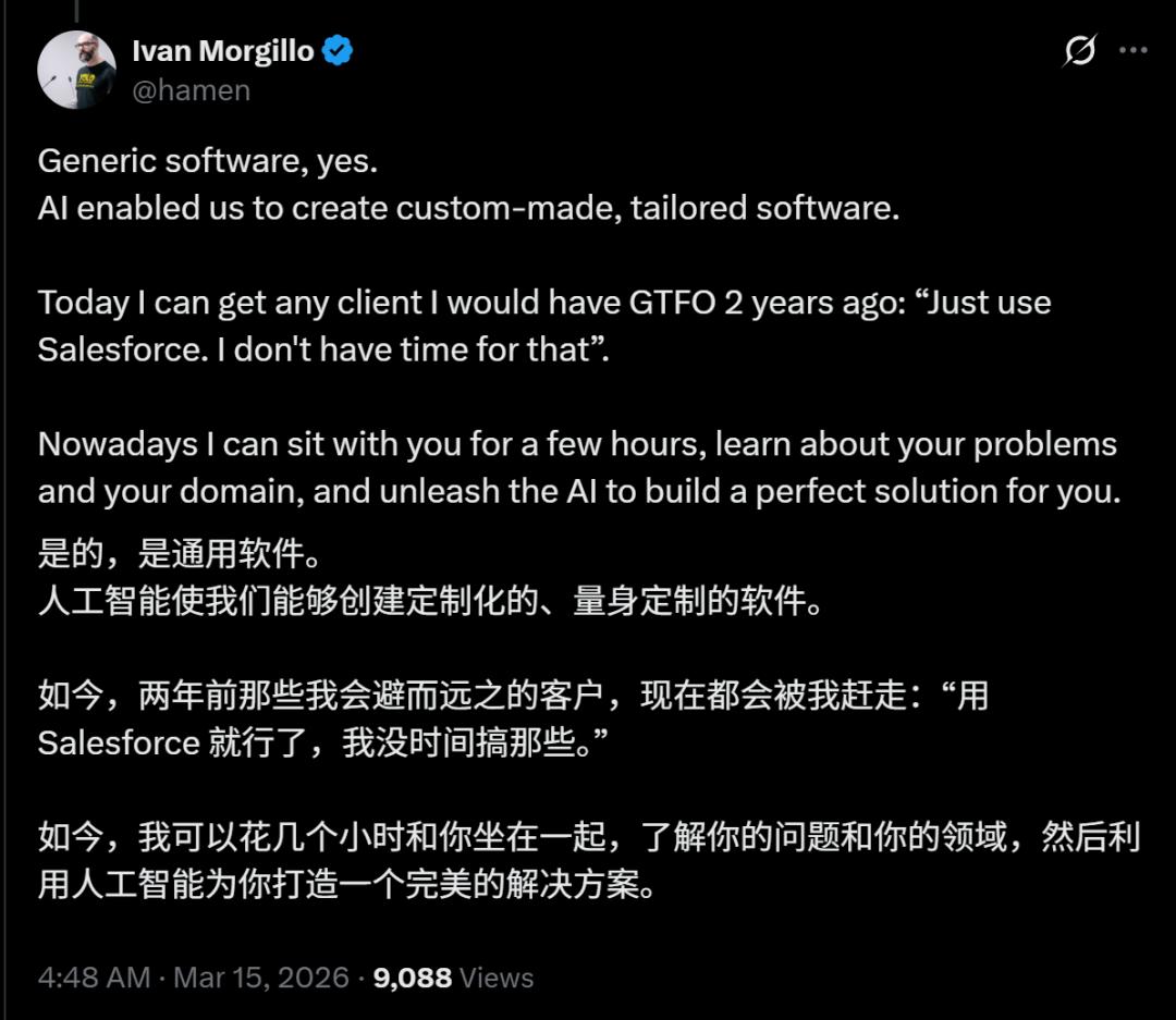 可以说,这是SaaS时代终结的一个标志性瞬间。AI的浪潮,正在冲垮传统软件帝国。