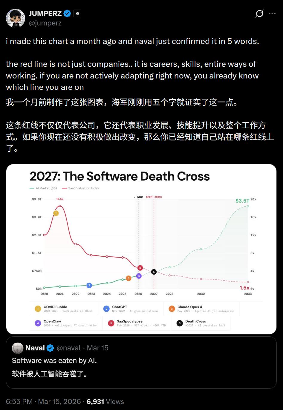 今天,被马斯克转发的这句话点燃了全网:「AI正在吞噬软件行业!」同时出现的一张图中,红线崩盘绿线狂飙,在2027年将出现死亡交叉,届时,我们将见证SaaS的末日,传统软件帝国的轰然倒塌。