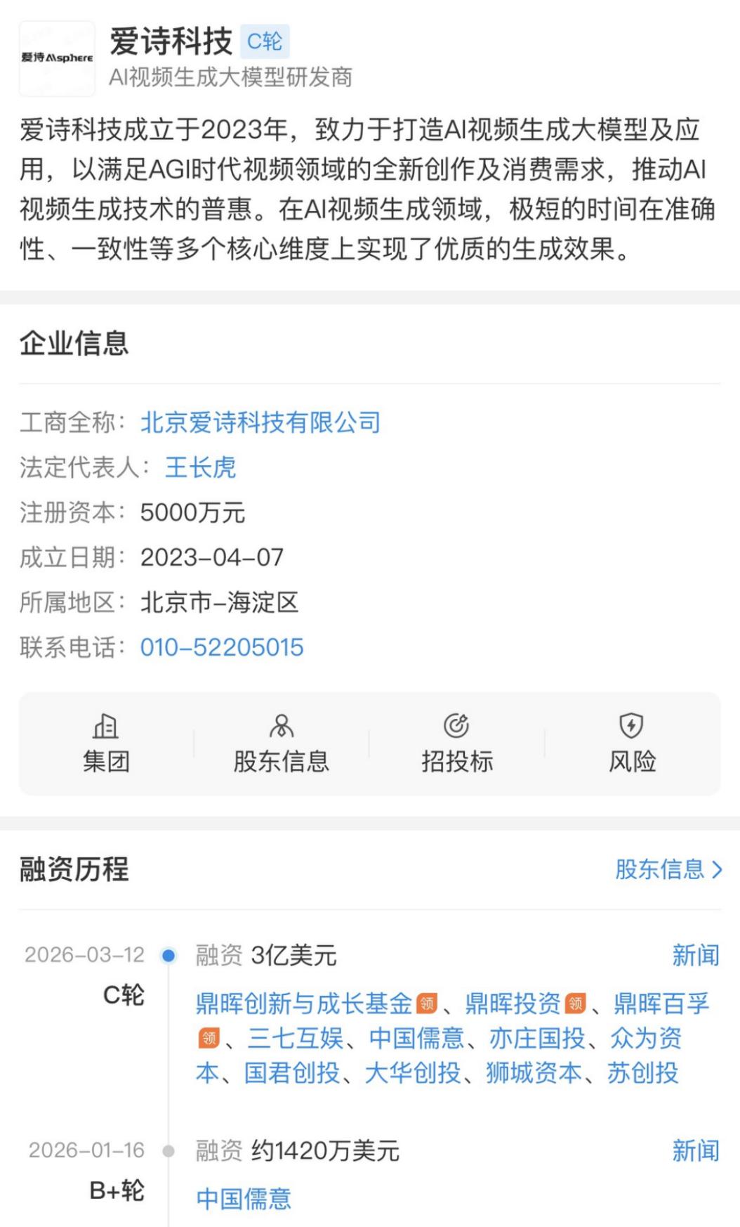 3月12日,据媒体报道,视频生成公司爱诗科技(PixVerse)完成了3亿美元的C轮融资。领投方是鼎晖投资,超过20家机构参与,其中包括中国儒意(参投《流浪地球》《孤注一掷》的影视公司)和三七互娱(国内头部游戏厂商)。这是目前中国视频生成领域最大的一笔单笔融资。