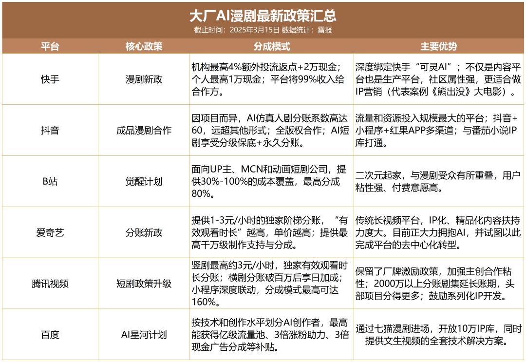 现在市面上主要的玩家,其实就是各大内容平台,每家打法不太一样。例如,抖音系的流量最大,算法最猛,是快速测试内容、制造爆款的绝对主战场;快手则深度绑定“可灵AI”,想从内容生产环节就抓住创作者,形成一个有特色的社区;B站、腾讯、爱奇艺等老牌长视频平台,用更高的分账比例和精品化的要求,吸引那些更有制作能力的团队,试图做出一些IP化、系列化的作品。