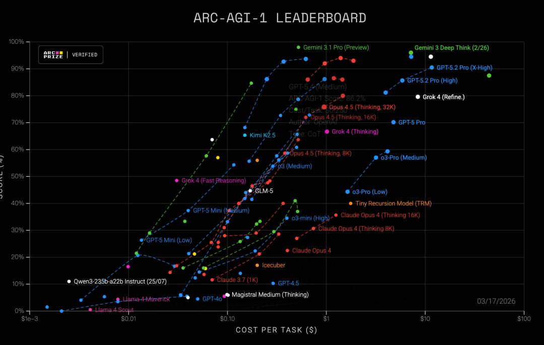 如果再看ARC-AGI-1,变化会更加夸张。