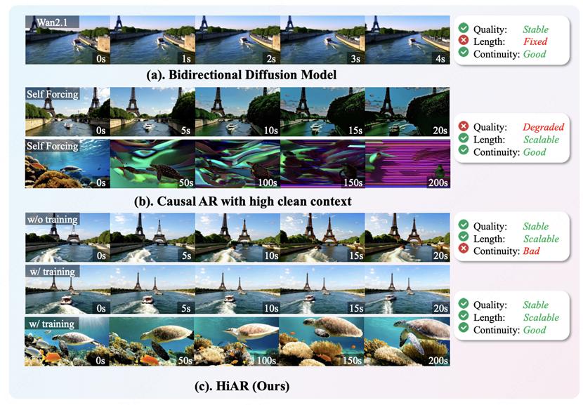 在团队的测试中,HiAR成功实现只训练5秒长度视频的情况下生成了3小时的高质量连续视频。