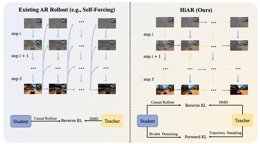 为了缓解这一退化问题,现有的方法尝试了多种路径,例如模拟预测误差、引入First frame sink或者Self-rollout机制。但这些修补方案都存在各自的局限性,比如使用frame sink往往会导致视频的场景变化受到严重限制。