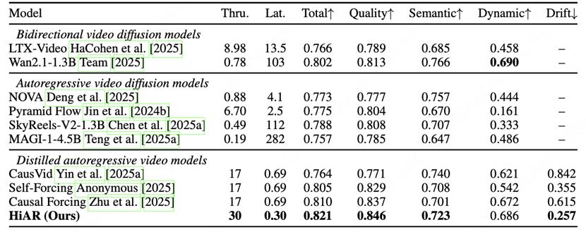 除了生成质量的飞跃,HiAR在工程落地上的优势同样明显。得益于分层去噪架构打破了传统AR模型“逐块串行”的枷锁,团队在4步去噪的设置下解锁了流水线并行推理能力。实验数据显示,在不牺牲任何视频质量的前提下,HiAR实现了约1.8倍的推理加速,吞吐量达到30 fps,单chunk延迟低至0.30s。这为高质量长视频的实时流式生成铺平了道路。