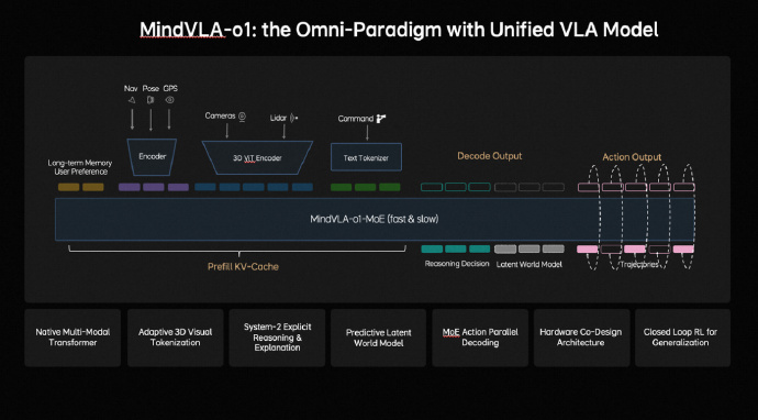 据介绍,MindVLA-o1 通过五大技术创新 ——3D 空间理解、多模态思考、统一行为生成、闭环强化学习和软硬件协同设计,构建面向物理世界智能的自动驾驶基础模型。