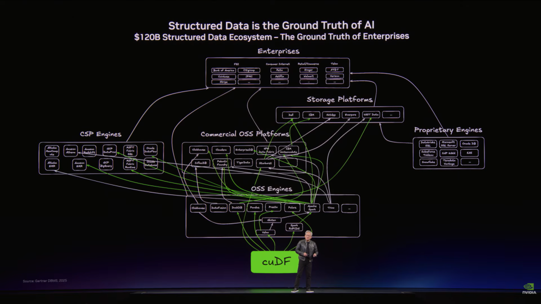 现在我们让AI来解决这个问题。利用多模态感知与理解技术,AI能够阅读PDF并理解其含义,将其嵌入到可搜索和查询的更大结构中。为此NVIDIA创建了两个基础库:用于数据框和结构化数据的cuDF,以及用于向量存储和非结构化AI数据的cuVS。这两个平台将成为未来最重要的平台,我们正将其深度融入全球复杂的数据处理系统网络中。