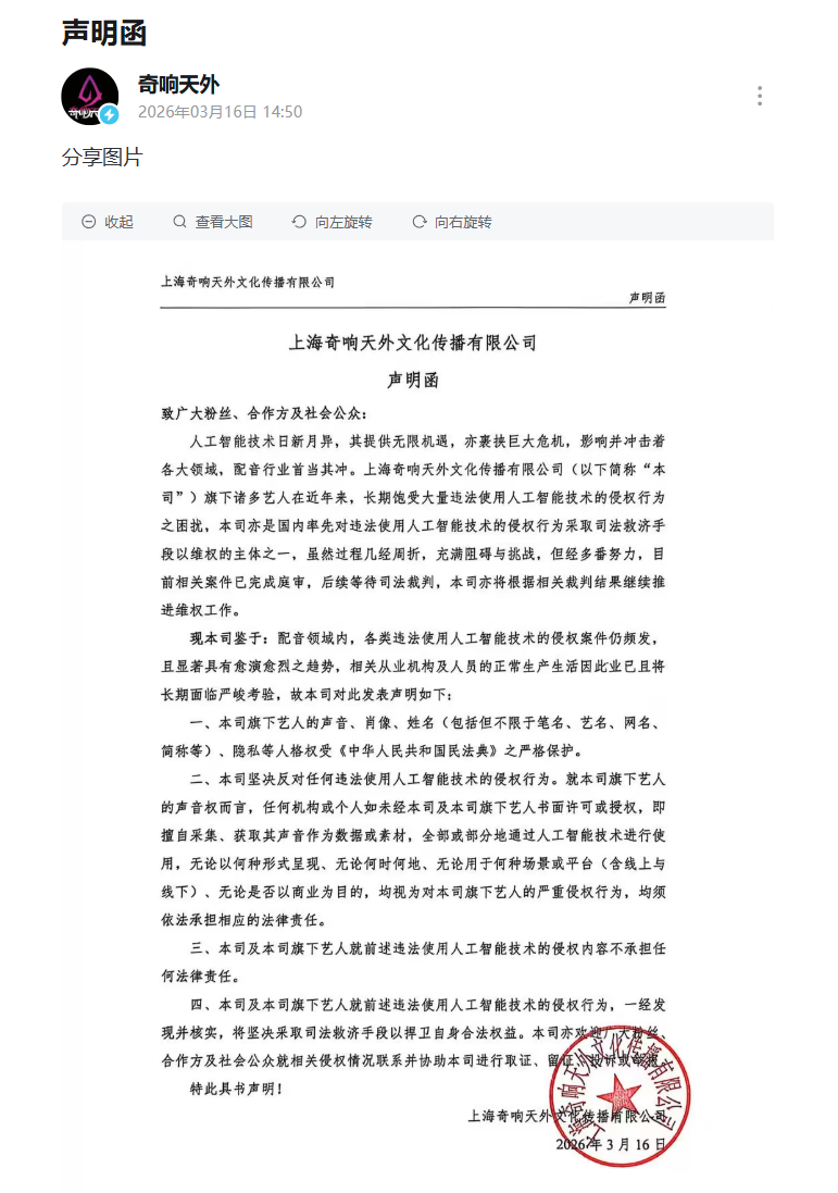 IT之家 3 月 17 日消息,国内主攻游戏和动漫配音领域的公司 —— 上海奇响天外文化传播有限公司(简称“奇响天外”)昨日发布声明函,宣布坚决反对任何违法使用人工智能技术的侵权行为。