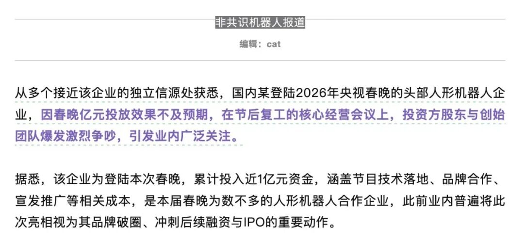 “从多个接近该企业的独立信源处获悉,国内某登陆 2026 年央视春晚的头部人形机器人企业,因春晚亿元投放效果不及预期,在节后复工的核心经营会议上,投资方股东与创始团队爆发激烈争吵…”
