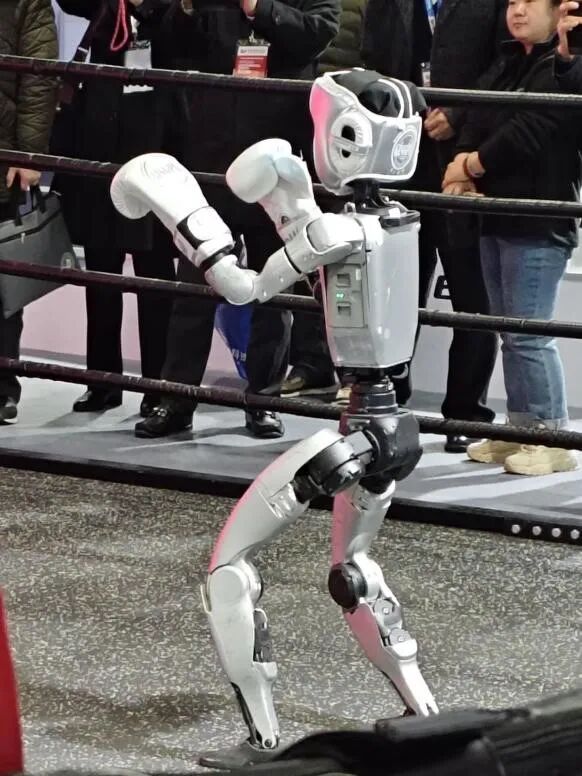 宇树科技的展台则充满了火药味。他们直接搭起了拳击擂台,春晚同款的G1人形机器人化身“铁甲拳王”,现场上演格斗竞技。其体重仅约35kg,却能完成空翻、跳跃等高难度动作,依托的是自研的高性能电机与运动控制算法。在擂台上,直拳、勾拳、闪躲、起身反击,动作丝滑流畅,再次打破了机器人动作僵硬的刻板印象。