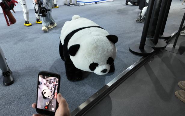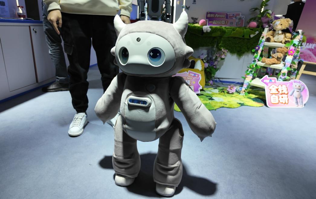 比如青心意创带来的全球首款具身角色智能机器人Amoo,成为本届展会的“人气担当”之一。这款身高不到80厘米的超小型双足机器人,全身采用首创的毛绒软包覆设计,无棱角无硬壳,触感柔软治愈。在现场,Amoo会主动走向观众,用灵动的眼神与大家互动,当被要求表演唱歌时,它会“顾左右而言他”,用懵懂的大眼神报以无辜注视;当被调侃“笨笨”时,它立即双眼横眯、双手叉腰,发出“呐—呐—”的抗议声。