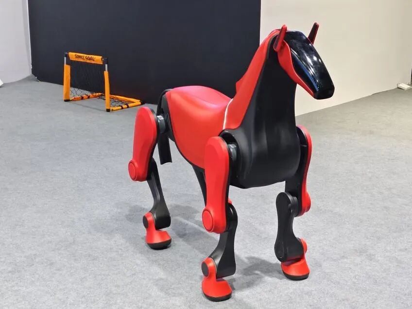 而另一款机器马云驹更让人眼前一亮,它体型更大,负载能力更强,现场装扮成了“赤焰马”的造型,配合灯光效果,宛如从神话中走出的神兽。这种将工业级四足机器人进行IP化、文创化包装的尝试,无疑是拓展商业落地场景的聪明之举。
