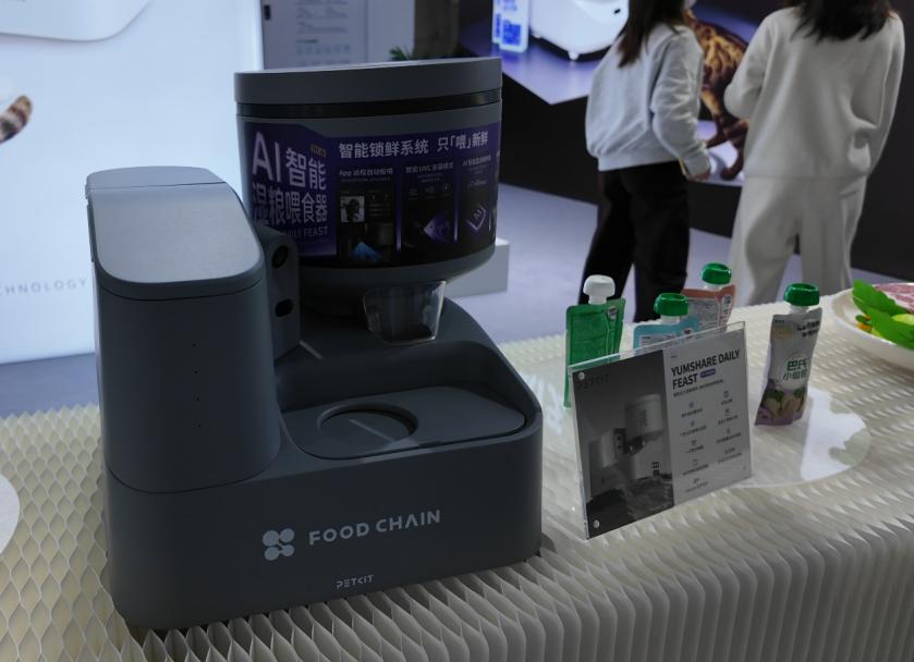 小佩展台前围满了养宠物的年轻人。这次他们带来了刚刚在CES 2026上获奖的全球首款全自动AI宠物湿粮喂食器。这款产品内置1080p超广角AI摄像头,能实时捕捉宠物进食行为,并通过多猫识别算法,为每只猫咪提供个性化的饮食数据分析。这精准击中了多猫家庭湿粮喂养的痛点——食物易变质、无法追踪每只猫的食量。