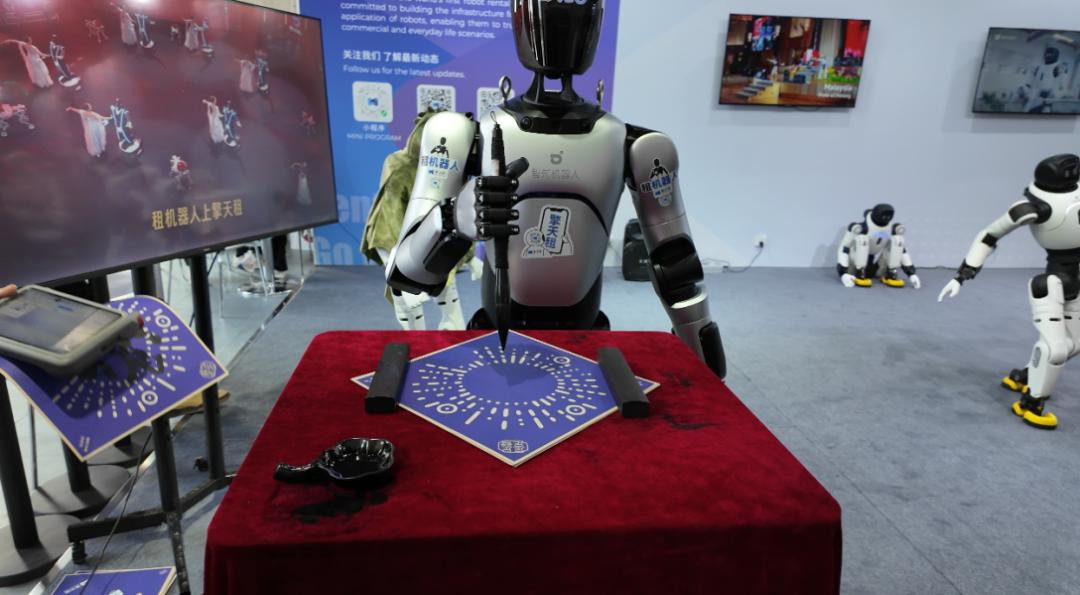 智元机器人此次携全系产品亮相,阵容堪称豪华。远征A2全尺寸人形机器人在现场握笔挥墨,写下“福”“禄”二字,笔画虽显生涩,但那份专注的神态让人恍惚间觉得是在看一位学生在习字。这款专为交互服务场景量身定制的机器人,身高169cm、体重约69kg,全身拥有超过40个自由度,内置700Wh电池可支撑约2小时续航。