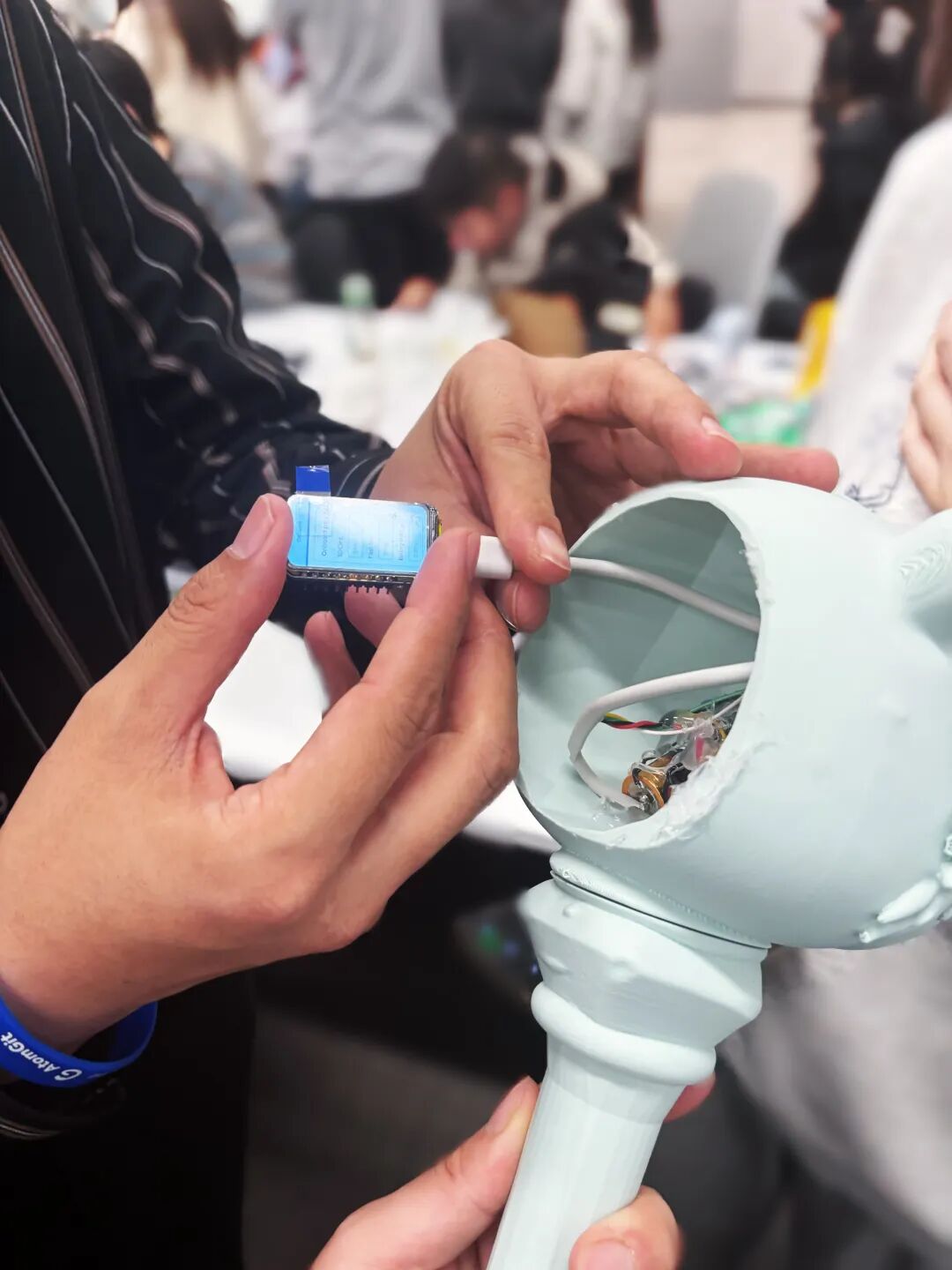 在现场,他们直接展示了和Rokid智能眼镜交互,隔空指挥打印机打印出了现场观众的照片。与此同时,他们的手环也在实时记录着他们路演时的状态。