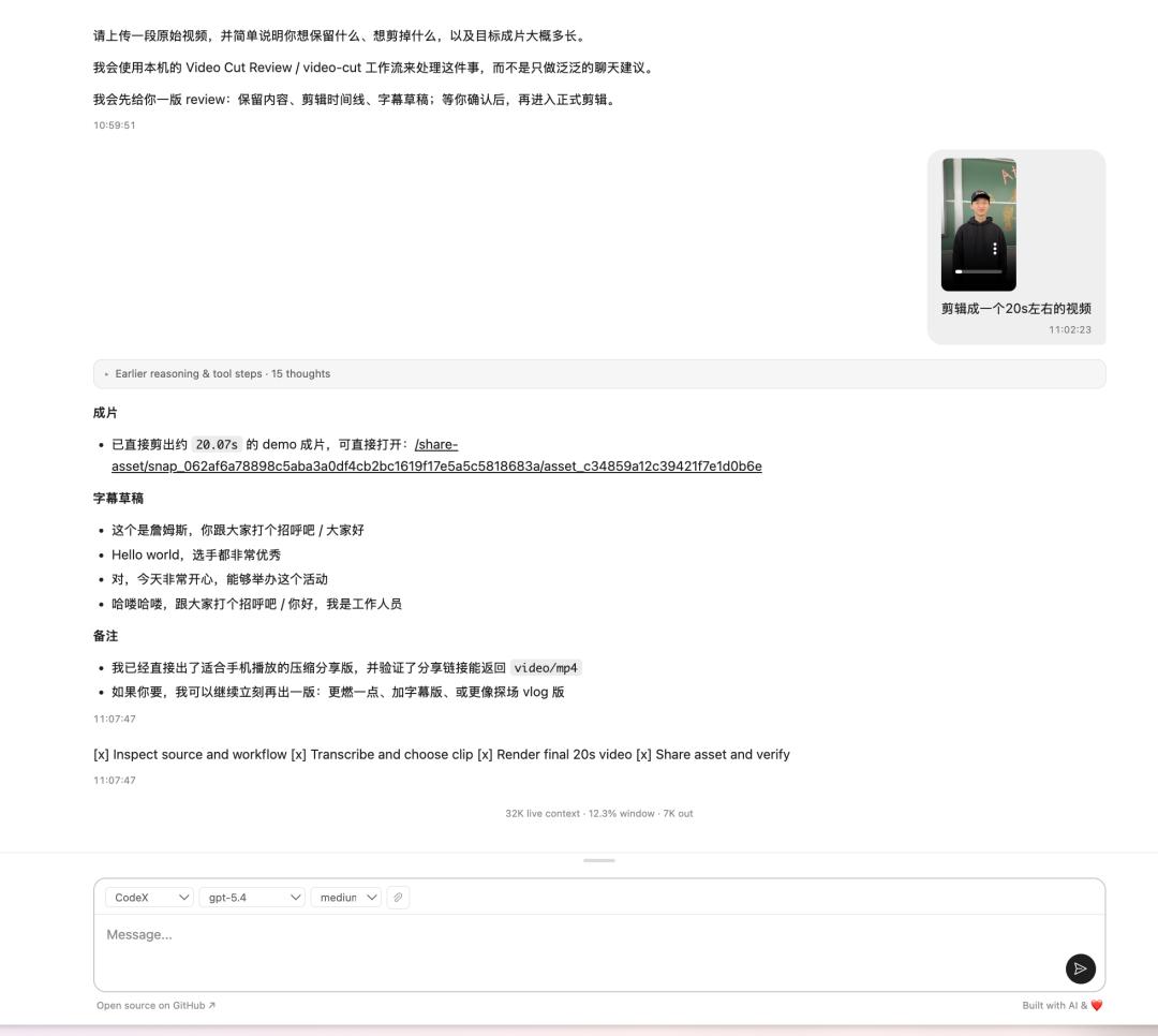 比如,先用自然语言,RemoteLab生成了一条“将一分钟的视频素材剪辑成20秒的视频成片”的工作流,而后打包成一个模板。任何人打开链接,都可以复用工作流,实现将成片剪辑成20秒的相同效果。