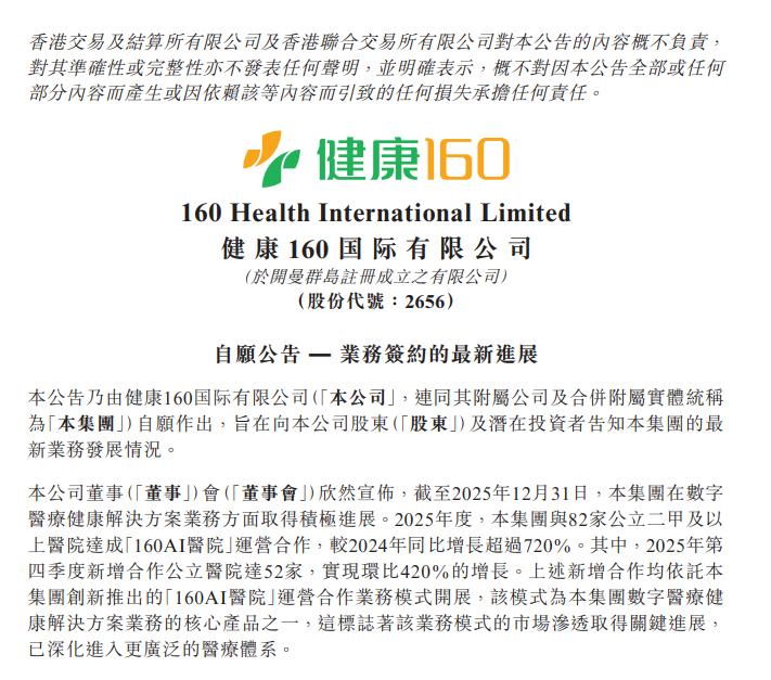 截至2025年底,健康160已与82家公立二甲及以上医院达成“160AI医院”运营合作,仅第四季度就新增52家,环比增长420%。