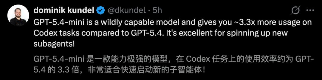 而且mini在Codex中只消耗GPT-5.4配额的30%。
