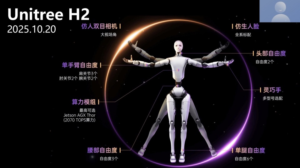 同期我们还发布了H2大尺寸人形机器人,身高1.8米,人体比例更好,灵活度更高,尺寸更大,适合承担一些体力类工作,在工厂、农业等场景会更加适用。