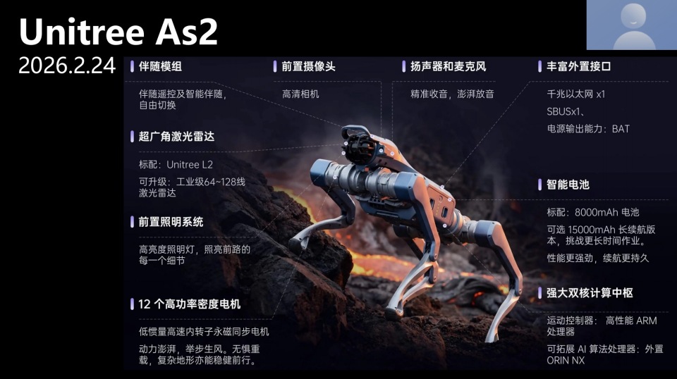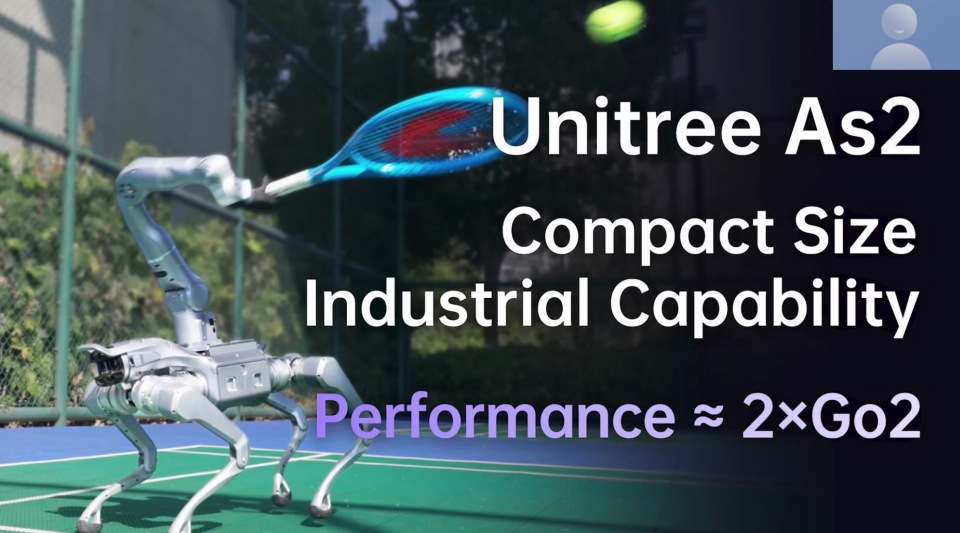前段时间我们还发布了小型高性能机器狗As2,是动力性能更强的小型化平台,自重约18千克,负载能力强,可以搭载吸尘器等设备,同时我们在其中融入了更仿真的拟人、拟动物运动模型,在小尺寸平台上也能实现强运动能力与作业能力。