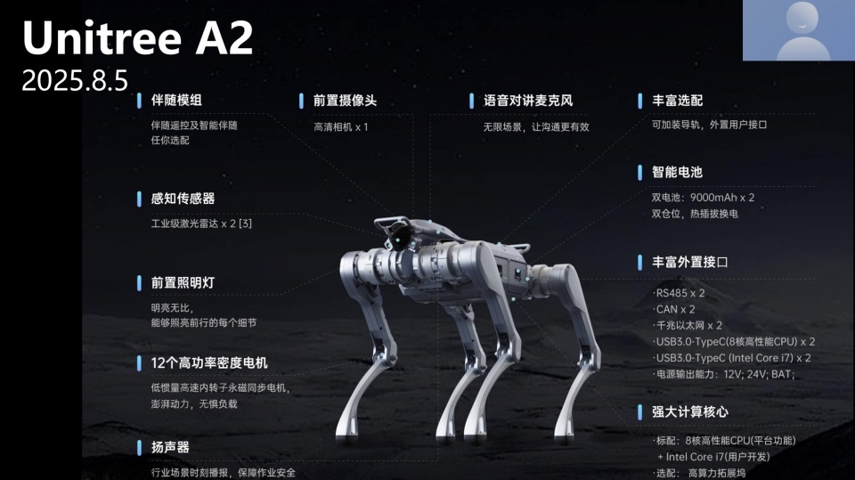 去年,我们又发布了A2这款中型工业级机器狗,性能指标非常突出,可用于室内和室外的巡检、巡逻等任务。
