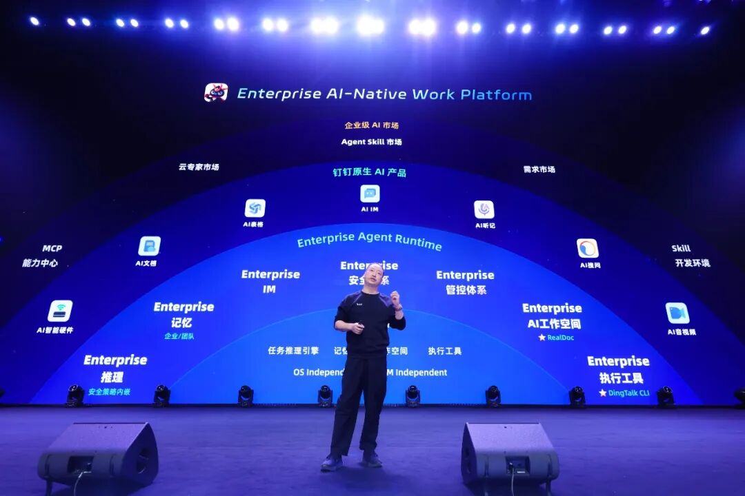 他解释说,这是因为,新时代的 AI work platform 不依赖于钉钉本体。“至于你是用钉钉还是不用钉钉,你用 Slack 还是 teams,还是用飞书还是企业微信?无所谓,悟空都可以接。”