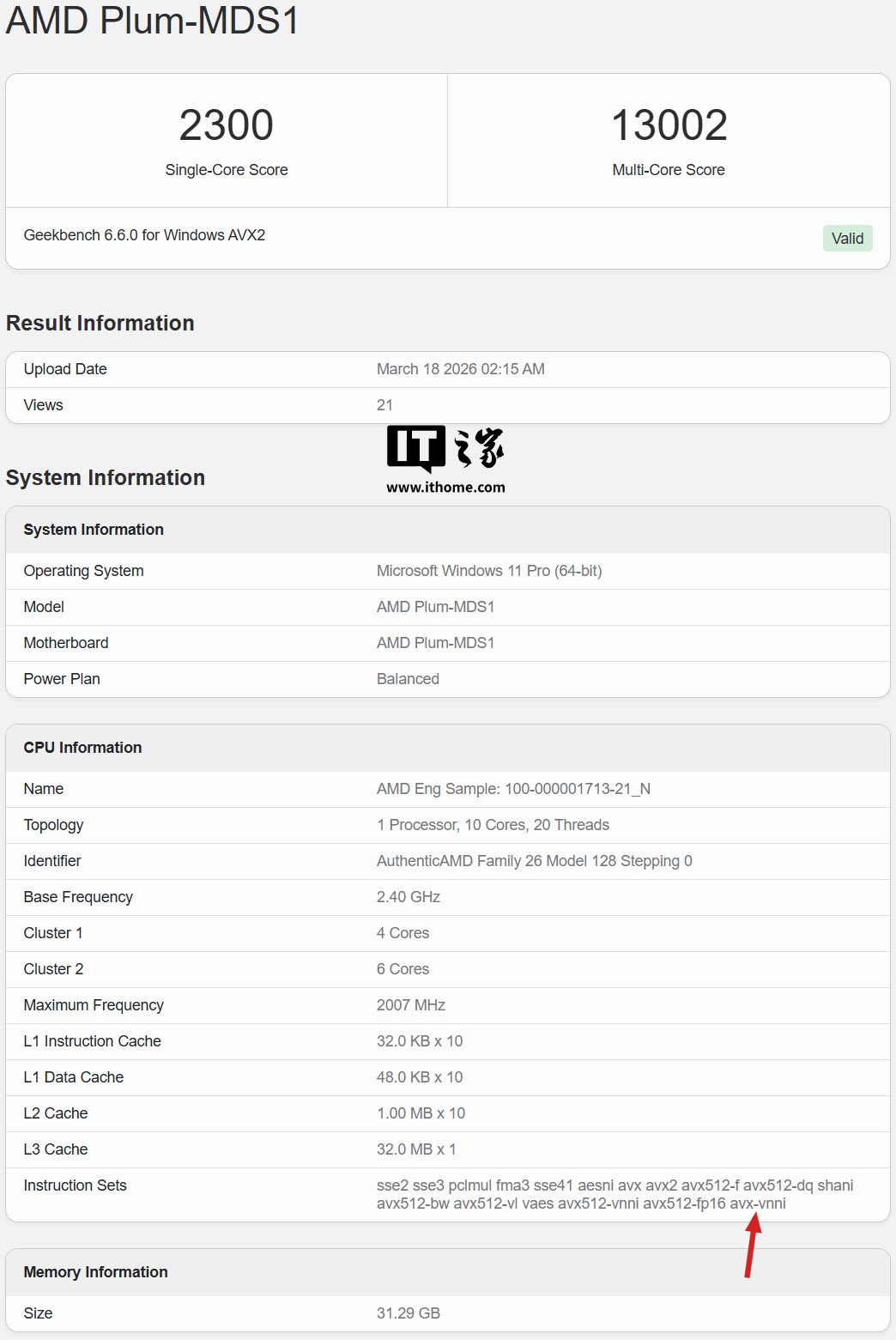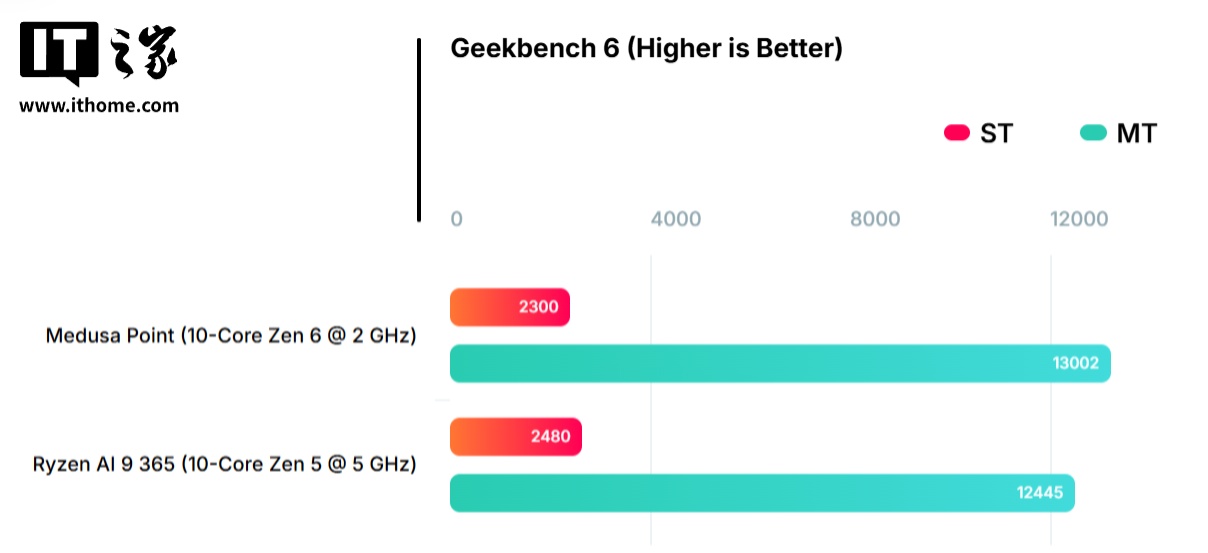 IT之家 3 月 18 日消息,科技媒体 Wccftech 今天(3 月 18 日)发布博文,报道称在 GeekBench 跑分库中,再次发现了 AMD Medusa Point “Zen 6” APU 的踪迹,6.6.0 版单核成绩 2300 分,多核成绩为 13002 分。
