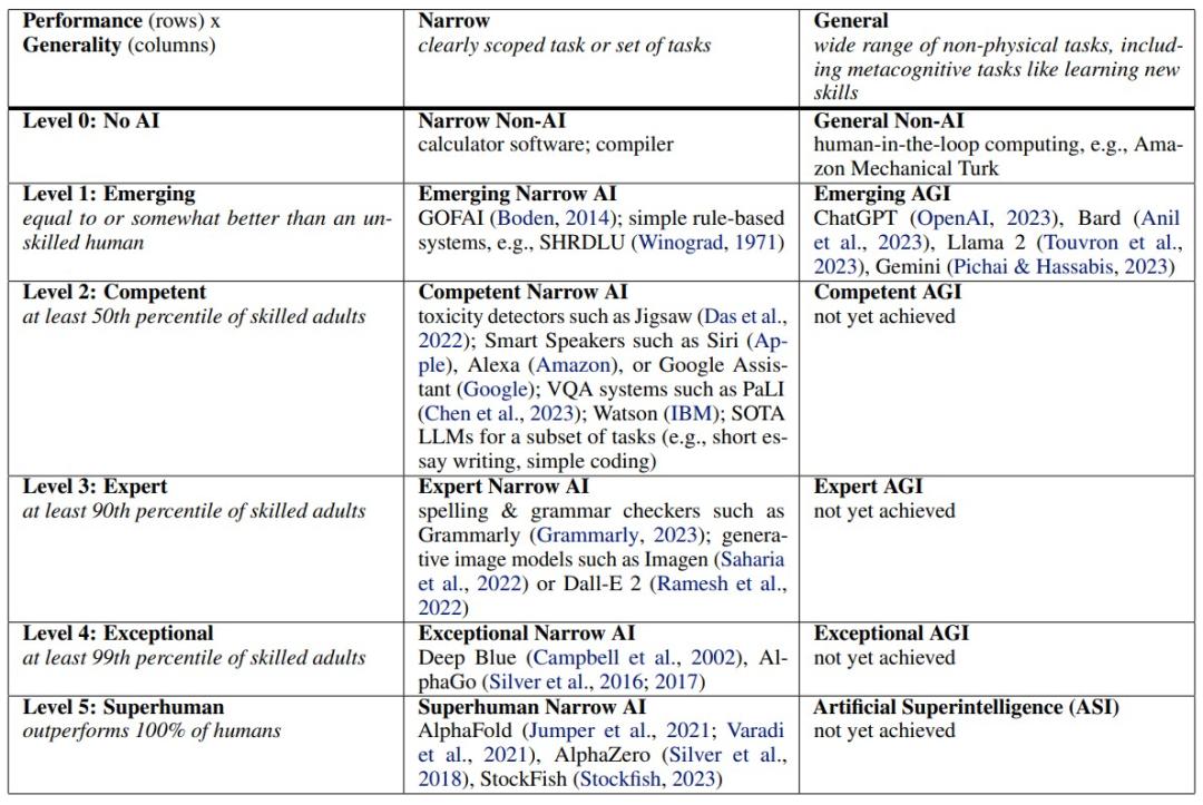 2023年,同一个团队发表了著名的「Levels of AGI」框架,把通往AGI的路拆成了5个性能等级。
