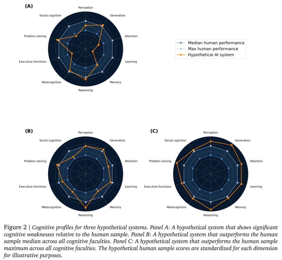 具体来说,AGI的评估被细化为10个关键的认知领域,包括感知、生成、注意力、学习、记忆、推理、元认知、执行功能、问题解决以及社会认知。