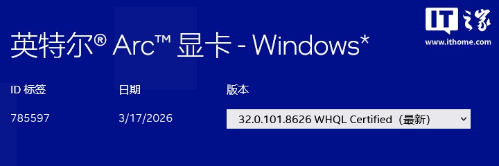 IT之家 3 月 18 日消息,英特尔当地时间 17 日为锐炫 Arc 显卡推出了 32.0.101.8626 版本的 Windows 操作系统驱动程序。IT之家注意到,该版本也得到了 WHQL 认证。