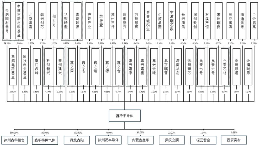近两年,鑫华半导体无控股股东且无实际控制人,第一大股东合肥国材叁号及其一致行动人中建材新材料基金持股比例合计为25.55%,第二大股东集成电路基金持股比例为20.62%。