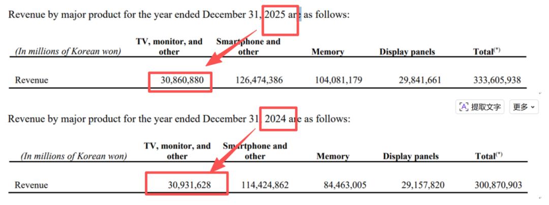 在业绩层面,2025年三星业绩呈现极端分化,半导体部门凭借HBM高端存储芯片,第四季度营业利润暴增465%至16.4万亿韩元,贡献集团80%利润。而家电与电视业务则连续两个季度亏损,成为业绩拖累。分产品来看,电视和显示产品的营收下滑,成为主要因素。据业绩报告,2025年全年三星电视及显示产品营收30.86万亿韩元,较2024年的30.93万亿韩元轻微下滑。