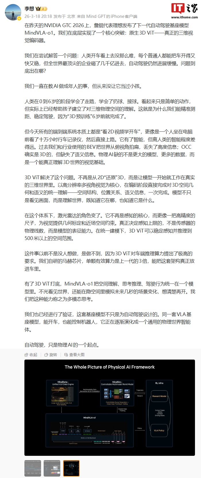 IT之家 3 月 18 日消息,在昨日的 NVIDIA GTC 2026 上,理想汽车基座模型负责人詹锟发布了下一代自动驾驶基础模型 MindVLA-o1。