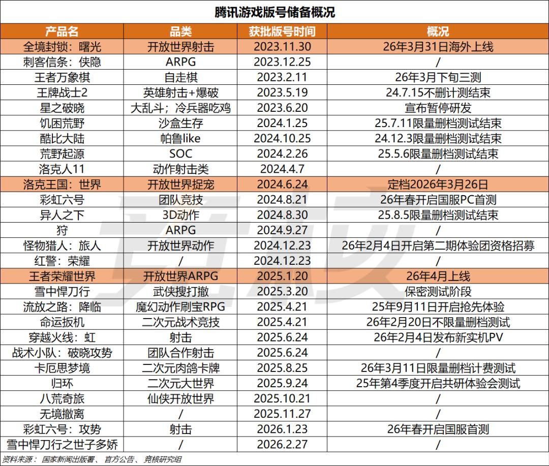 当然,腾讯游戏的储备还不止如此。根据竞核不完全统计,腾讯手上的版号储备约有30个。覆盖射击、自走棋、SOC、捉宠、3D动作、开放世界ARPG、动作搜打撤等。