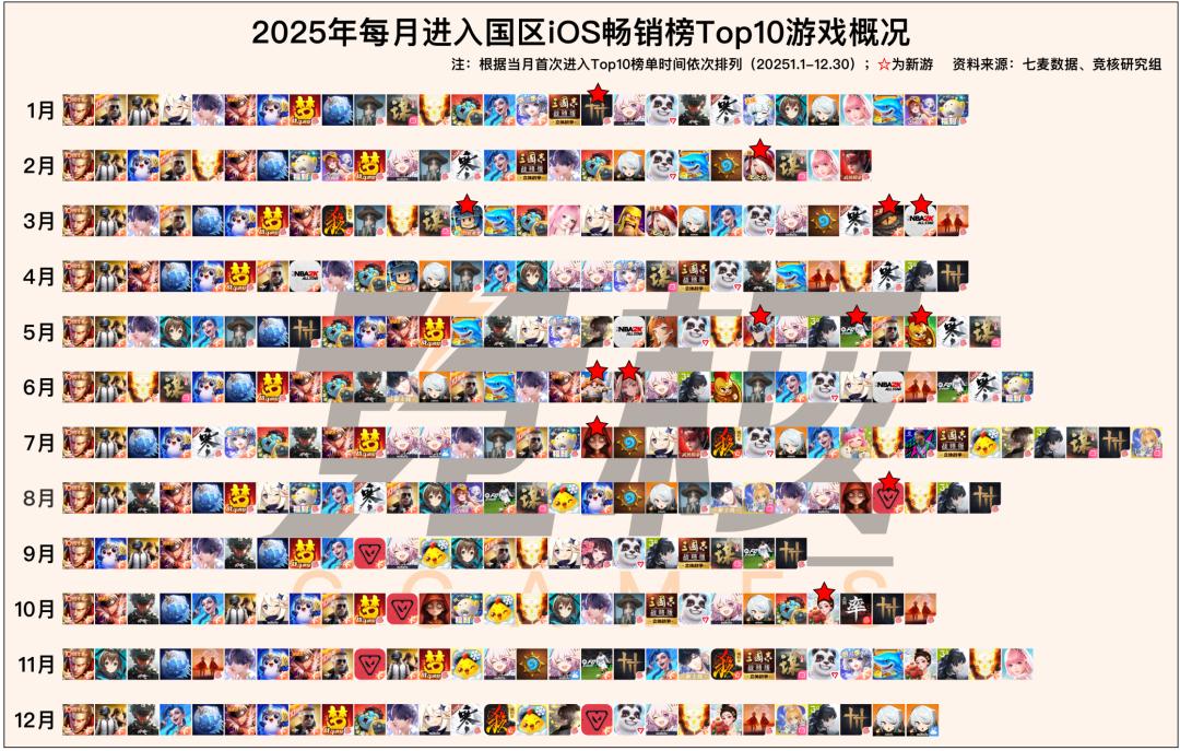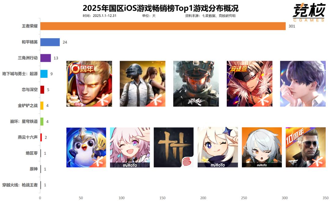 早前竞核在《2025游戏行业再也不见,Hello 2026》一文中简单做了盘点,《王者荣耀》《和平精英》《穿越火线:枪战王者》《地下城与勇士:起源》《火影忍者手游》《金铲铲之战》《英雄联盟手游》等长期位居iOS畅销榜前十。