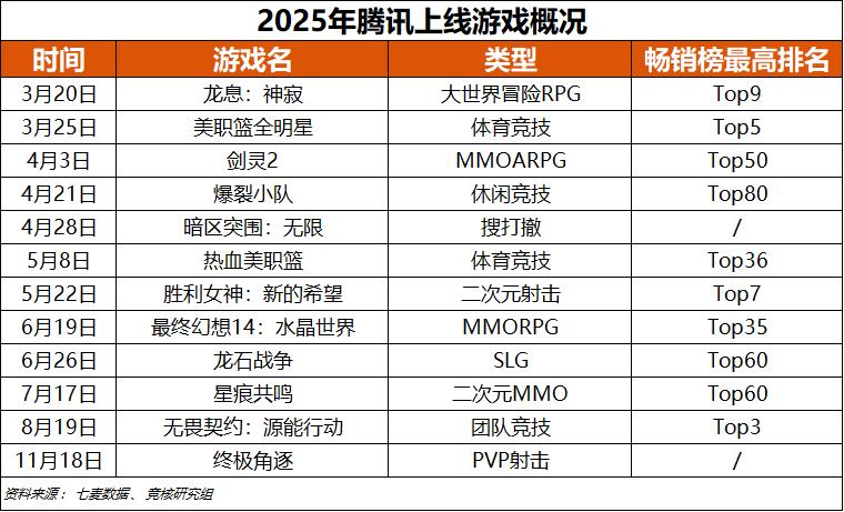 根据竞核不完全统计,2025年腾讯游戏上线了约12款新作。其中包括被腾讯高层视为“2025年发行最成功的竞技新游”的《无畏契约:源能行动》,魔方工作室PC搜打撤《暗区突围:无限》,以及二次元射击《胜利女神:新的希望》等。