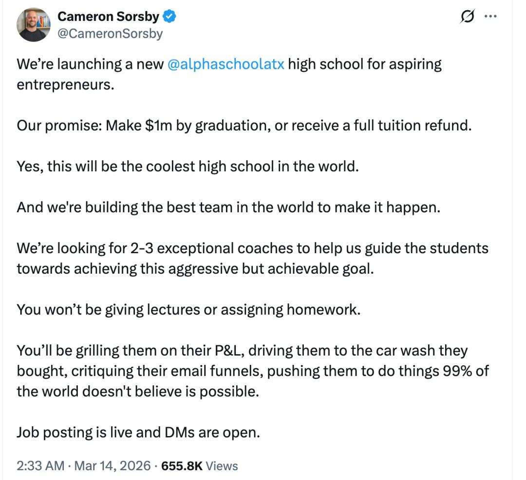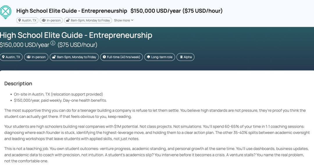 招聘信息描述,Alpha School的学生是正在构建真正企业的高中生,这些企业有达到百万美元级别的潜力。不是课堂项目,不是模拟游戏。